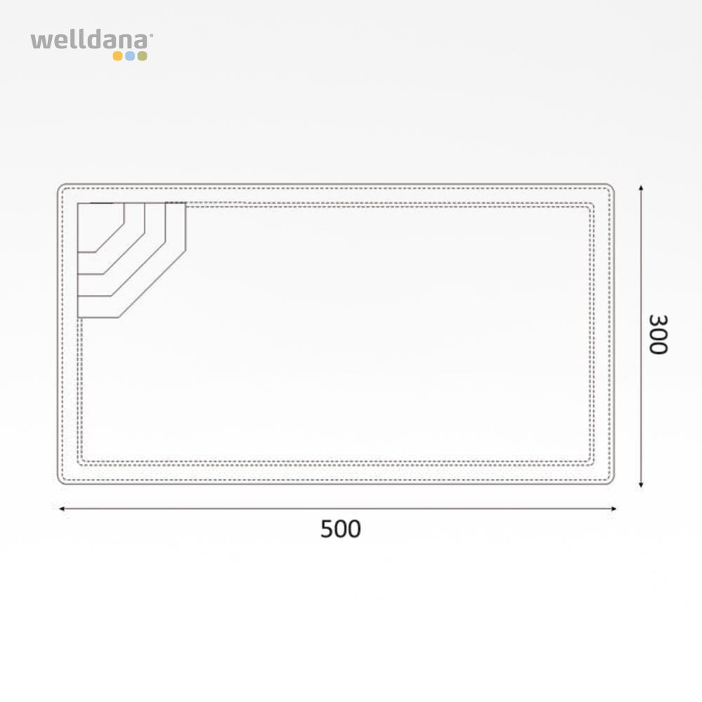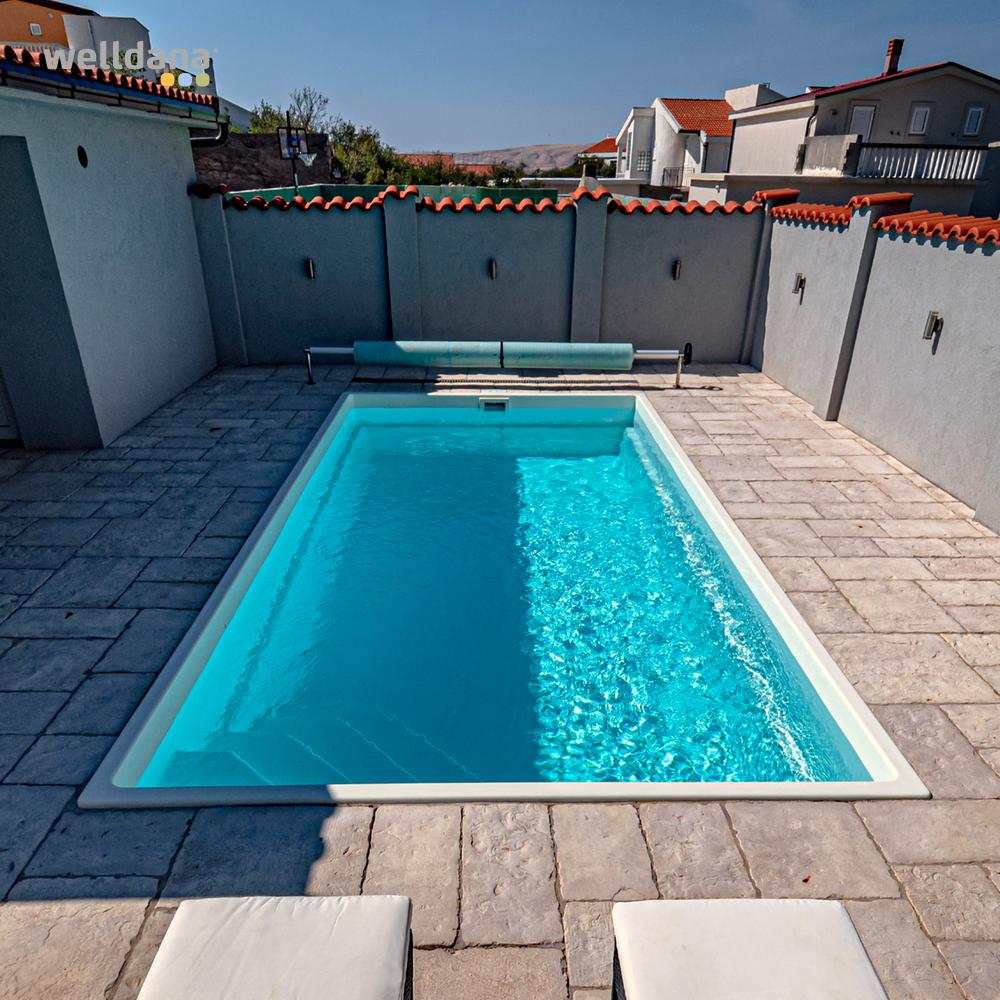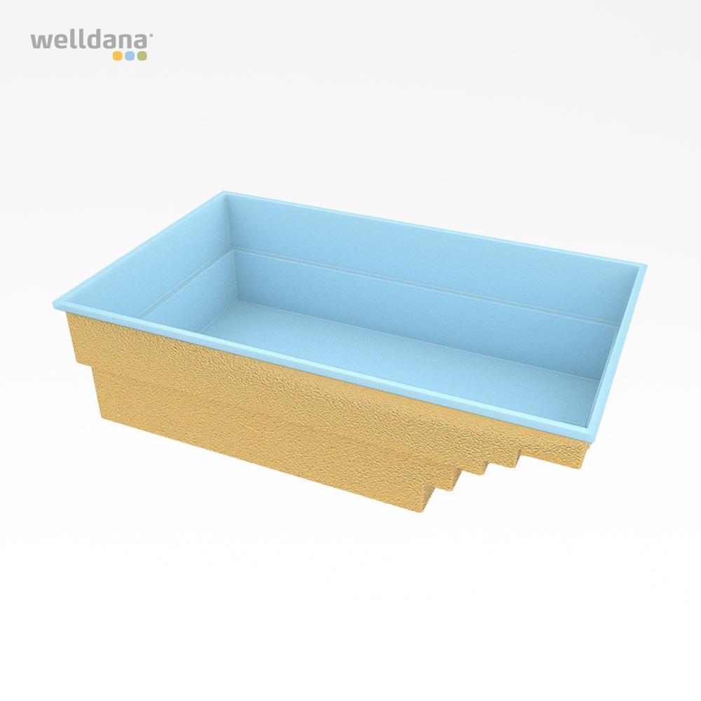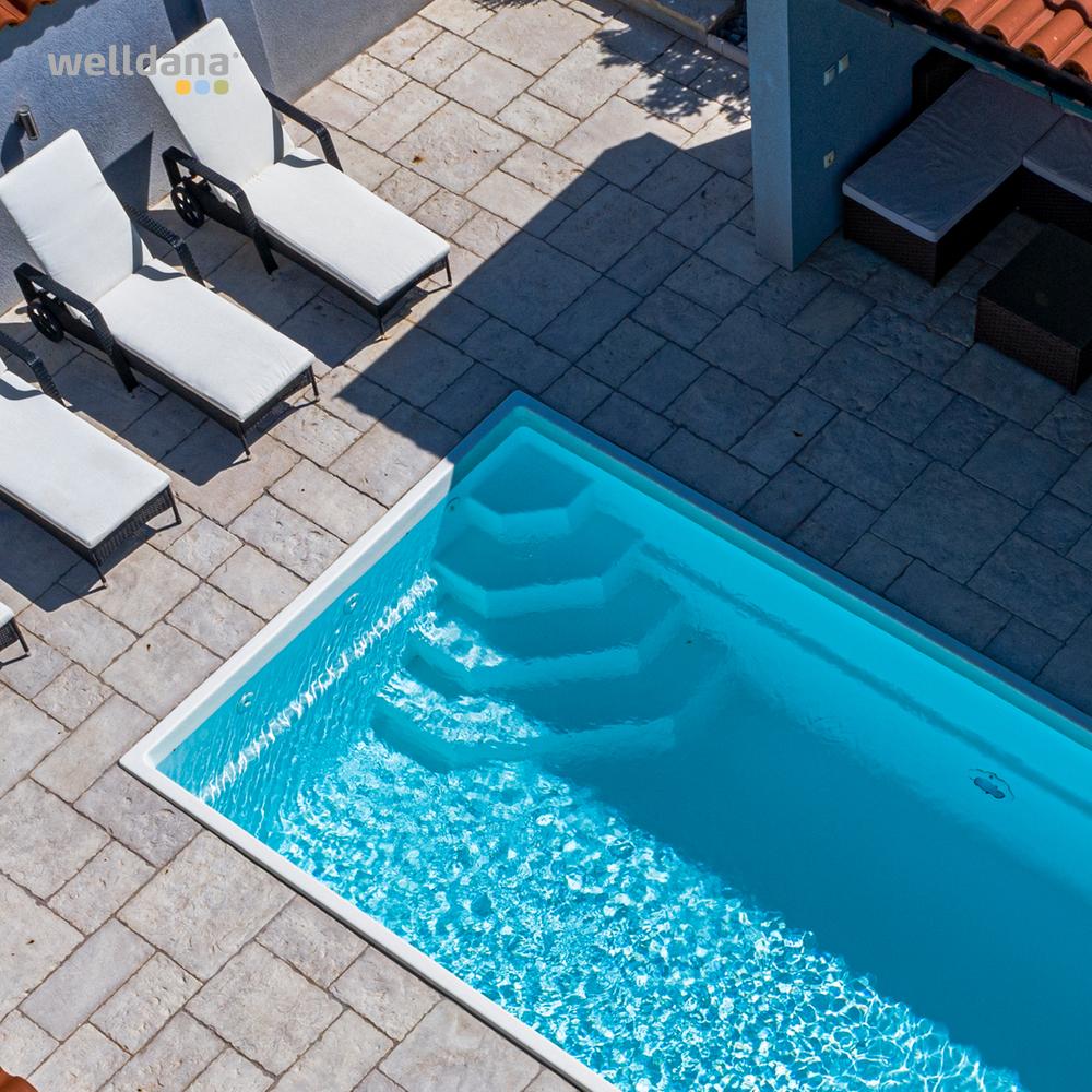 Welldana® Fiberpool model Madrid, en høj kvalitets flot pool fremstillet i 5 lags glasfiberarmeret polyester, forstærket med gelcoatet vinylester og keramisk belægning. Overfladen er sprøjtemalet med en meget miljøvenlig, UV hæmmende og stærk kvalitets maling, for super flot finish. Leveres standard isoleret med ca. 20mm påsprøjtet polyurethan isolering. Monteres nedgravet på fast underlag med støbte sider.