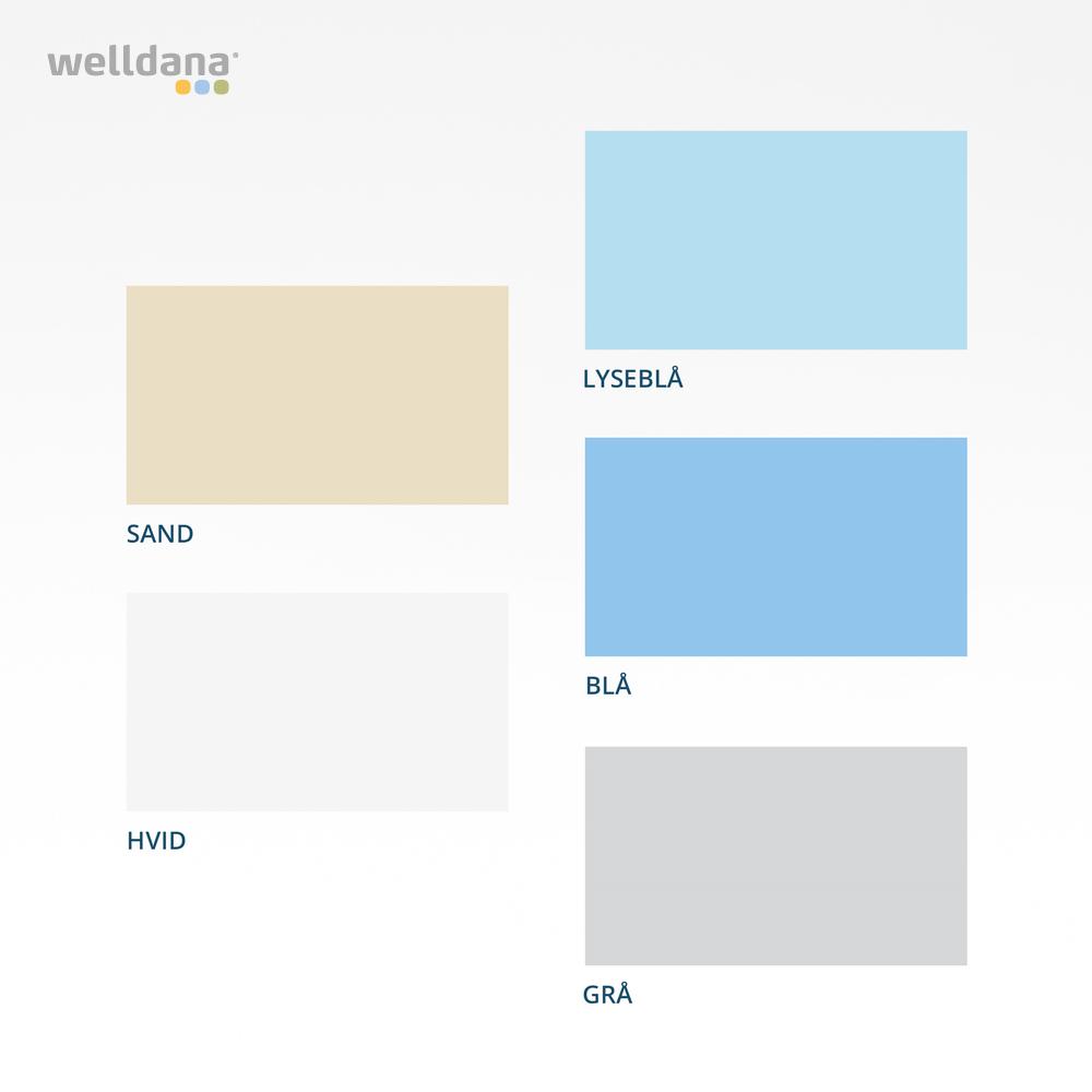 - Standard farver: blå, lyseblå, hvid, sand og grå.