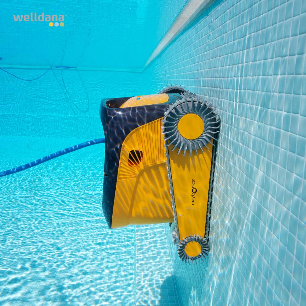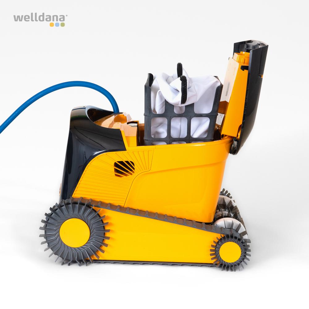 - udstyret med dobbelte retningsbestemte børster, der spinder 1,5x hurtigere end robotten, og sidebørster, der sikrer en grundig rengøring af hvert hjørne af poolen