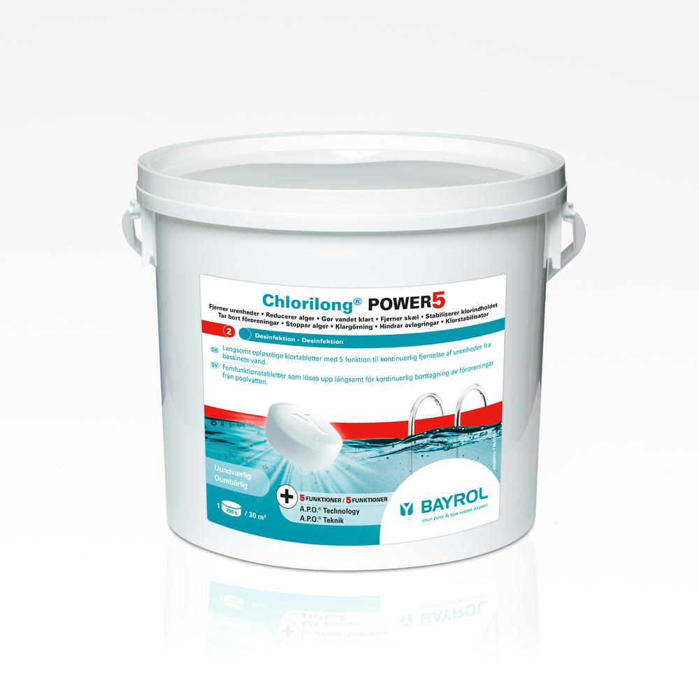 Chlorilong® POWER 5 er en langsom opløsende 250 g multifunktionel klor tablet til placering i skimmer eller flydedispenser